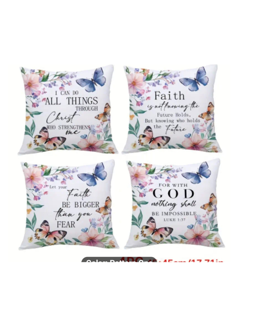 4pcs, Single-Sided Printed Pillowcase Set with Watercolor Butterfly Floral Bible Quote Design, 44.96*44.96cm Home Decor Throw Pillows for Living Room Sofa and Bedroom, Without Insert